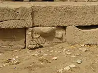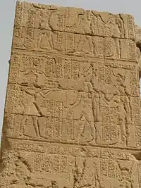 Today all that remains of the temple is its small main building and ruins of the propylon, along with its brick enclosure wall and the well.[2] The temple precinct had an area of 78×58 metres; the temple itself is much smaller, with an area of 13×16 m.[3] Its entrance faces south. The outer walls do not have much decoration but on the inside the reliefs are well preserved. The shrine is surrounded by a corridor from which side chapels and a wabet (place of cleansing) open; also the stairs lead to the roof from this corridor.[3] On the southern side of the outer wall some stone blocks from earlier buildings had been reused, judging from the reliefs on them most of them appear to be from Medinet Habu.