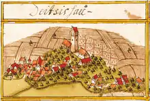 In the second half of the 16. century Deizsau became posting house on the first continuously run post line in the Holy Roman Empire, which back then headed from Venice to Antwerp.[6] The first namely known postmaster was in the year 1585 Carlin Taxis,[7] who descended the postal entrepreneurial family Thurn und Taxis.[8] Some of his descendants still live in Deizisau today which is why Taxis is one of the most common last names.[9]