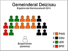 The municipal council of Deizisau has 18 members. The communal elections at the 25 May 2014 lead to the following official results:.[18] The municipal council consists of the elected honorary council members and the mayor as its chairman. The mayor is entitled to vote.