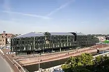 Delft is the main railway station of the city of Delft, South Holland, Netherlands. It is located on the oldest railway line in the country, between the stations of The Hague Central and Rotterdam Central. Along with a new 2.3 km rail tunnel under the city centre, the current station opened on 28 February 2015.[2] The new building, which integrates the station hall with the city's municipal offices, was designed by Mecanoo, an international architecture firm that originated in Delft. The project also included a rebuilt bus station, tram stops and improved bicycle parking.