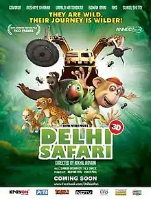Delhi Safari (also known as Jungle Safari) is a 2012 Indian computer-animated musical comedy film written and directed by Nikkhil Advani. The film traces the journey of five animals from Mumbai to Delhi as they struggle against an oppressive regime.[1][2] It has been produced by Krayon Pictures (a Pune-based 3D animation studio). Based on a story and concept by Advani, the film's Hindi-language version features the voices of Akshaye Khanna, Govinda, Suniel Shetty, Boman Irani and Urmila Matondkar. The screenplay of the film is written by Girish Dhamija and Suresh Nair. The music of the film is composed by Shankar–Ehsaan–Loy, while the lyrics are penned by Sameer. It is India's first stereoscopic 3D animation feature film.[3] The film released in India on 19 October 2012. Delhi Safari has been granted exemption from entertainment tax in the states of Maharashtra and Delhi.[4] At the 60th National Film Awards, it won the National Film Award for Best Animated Film. The English-language version of the film has voices by Tom Kenny, Carlos Alazraqui, Jason Alexander, Cary Elwes, Tara Strong, Christopher Lloyd, Jane Lynch, Vanessa Williams and Brad Garrett. The international sales of the film is being handled by Fantastic Films International. The film was released in the United States on 7 December 2012.[5]