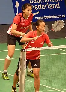 Della Destiara Haris (born 8 December 1992) is an Indonesian badminton player affiliated with Jaya Raya Jakarta club.[1] In the junior event, she was the mixed doubles silver medalist at the 2009 World Junior Championships, and also the mixed team and doubles bronze medalists at the 2010 Asian Junior Championships.[2] She won her first international title in 2010 Indonesia International, and claimed her first Grand Prix title in 2016 Vietnam Open.[3] Haris was two times Asian Championships bronze medalists winning in 2018 and 2019.