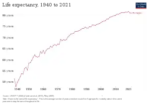 High fertility and birth rates persisted until the 1980s, after which they started to dramatically decline, leading to rapid population aging. At the end of the first decade of the 21st century, almost one in five Portuguese was over 65 years old.[4] Lately, Portugal has been experiencing a short growth in birth rates. The total fertility rate has climbed from an all-time low of 1.21 children per woman in 2013 to 1.43 in 2022, still well below replacement level.