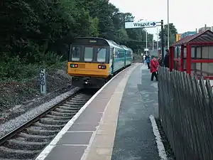 The station has only a single platform. It is accessed by either a ramp from the car park or by a subway. The only remaining station buildings are in private industrial use, but there is a standard waiting shelter on the platform. Timetable information is provided on posters and passenger information displays, there are also automated announcements.[2] No step-free access is available to the platform - the main entrance via the car park has a high kerb that can cause difficulties for wheelchair users, whilst the pedestrian subway at the south end has steps.
