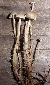 The stem is 4 to 6 cm (1.6 to 2.4 in) long by 1 mm thick, roughly equal in width throughout, and tapers to a long "root" which terminates in a dull black, roughly spherical sclerotium.[14] The stem may be buried deeply in its substrate.[13] The stem surface is roughly the same color as the cap, with a fine whitish powder on the upper surface. In the lower portion, the stem is brownish, and has fine grooves that run lengthwise up and down the surface.[15] The lower half is covered with irregularly arranged short branch-like protuberances at right angles to the stem that measures 2–3 by 0.5 mm. These projections are cylindrical and tapering, with ends that are covered with a slime head of conidia (fungal spores produced asexually). D. racemosa is the only mushroom species known that form conidia on side branches of the stem.[16] The sclerotium from which the stem arises is watery grayish and homogeneous in cross section (not divided into internal chambers), with a thin dull black outer coat, and measures 3 to 6 mm (0.12 to 0.24 in) in diameter.[14] American mycologist Alexander H. Smith cautioned that novice collectors will typically miss the sclerotium the first time they find the species.[17] The edibility of D. racemosa is unknown,[17] but as David Arora says, the fruit bodies are "much too puny and rare to be of value."[10]