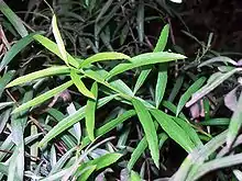 Leaves are 10 to 80 mm long, 2 to 13 mm wide, narrow lanceolate to ovate in shape. Leaf edges are curved over, sometimes with toothed edges, other times entire. Leaf tip sometimes curved. The leaf base slowly tapers away with a thin beginning of the leaf. Leaf stalks 2 to 5 mm long. Leaf venation evident on both sides, 5 to 8 pairs of lateral veins. Leaflets with lenticels, slender and smooth in shape, dark reddish brown or grey. New shoots downy.