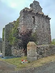 The tower house is cross shaped, comprising a main block, a stair-tower projecting centrally, and a matching small rectangular tower. The structure has three storeys, and a garret with a corbelled-out parapet at one gable. There are large windows, and a number of gunloops. A courtyard surrounded the castle.[1]