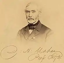 In 1826, Mahan went to Europe to study advanced engineering, and from 1829 to 1830 he was a student at France's school of engineers and artillery in Metz.[2] Upon returning to West Point in 1830, he was promoted to professor of civil and military Engineering.[2] He resigned his second lieutenant's commission in 1832 to become chairman of West Point's Engineering Department, and he remained on the faculty until his death.[2] Mahan was subsequently appointed dean of the faculty and became a recognized authority on engineering.[2] In addition to becoming a member of several scientific and professional societies, he also carried out special appointments that took advantage of his technical skills.[2] In 1828, he was elected to membership in France's Société de Géographie.[3] In 1850, Governor John B. Floyd of Virginia appointed Mahan to the board that recommended a route for the Baltimore and Ohio Railroad to run from Cumberland, Maryland to a terminus in Wheeling, West Virginia, which was then part of Virginia.[2] In 1863, Mahan was an original incorporator of the National Academy of Sciences.[2] In 1871, he was appointed to the board of overseers for the Thayer School of Engineering at Dartmouth College.[4]