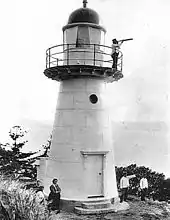 The tower was constructed in the unique Queensland method of constructing a timber frame and cladding it with non-structural iron plates or iron sheets.[2] The original apparatus comprised a fourth order lens with an oil wick burner[8] of 4,000 cd intensity.[2] Like other lighthouses at that time it used a clockwork mechanism with weights, which had to be wound periodically. Due to its short height, only 6 metres (20 ft) from the base to the lantern,[4] the mechanism had to be wound every 75 minutes.[9]