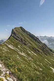 If we follow its south ridge, we can find Folliu Borna (1,849 m, the Vanil des Artses (1,993 m), the Cape au Moine (1,941 m), the Dent de Jaman (1,875 m) and finally les Rochers de Naye (2,042 m).
