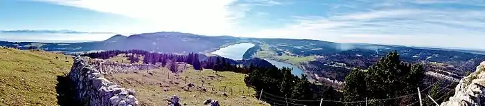 View from Dent de Vaulion a mountain peak of the Swiss Jura (summit 1482,6 m) overlooking the Mont Blanc massif (left side picture) the lakes of Joux and Brenet in the canton of Vaud.