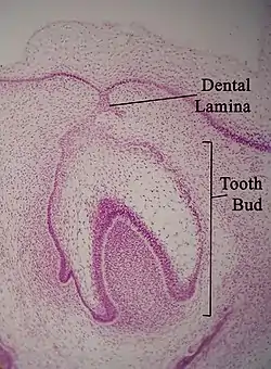 ![]() Micrograph of a dental lamina and tooth bud. H&E stain. | |