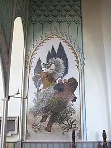 The interior of the church is decorated with biblical murals by the Northampton artist, Henry Bird. Plans were made for the works in 1960 and they were painted from February 1975 until the summer of 1976. They are on 16 panels with 31 life-size figures, many based on local people.[5][6]