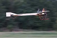 In later examples, such as that in the Shuttleworth Collection, the horizontal tail surface was shorter, the leading edges being swept at about 45°. A distinctive feature of the type was that the trailing edge of the rudder and elevator was braced by wires leading to the control horns. The controls consisted of a wheel mounted on an inverted U-shaped yoke, the uprights of which were outside the fuselage structure. Fore and aft movement of the entire yoke operated the elevator and the wheel operated the wing warping. The rudder was controlled by pedals. The undercarriage consisted of a pair of trapezoidal frames, each braced by a diagonal member extended forwards to form a short upcurved skid to protect the propeller in the case of nose-overs, with a pair of wheels carried on a sprung cross axle between the two frames.[4]