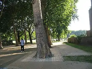 The park covers an area of 7.07 hectares (17 acres) and is accessed from Evelyn Street, with the entrance retaining traditional iron gates and railings and a small avenue of London plane trees. The original structure of the park is largely intact, with a perimeter pathway lined with further mature London planes.[1]