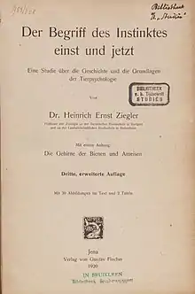 Der Begriff des Instinktes einst und jetzt (English: The concept of instinct in past and present times) is a book written by Heinrich Ernst Ziegler. Its first edition was published in the Zoologische Jahrbücher, Supplement VII (English: Zoological yearbooks) in 1904. The second edition, published 1910 by Gustav Fisher in Jena and third edition, published in 1920 under the same publisher both received several extensions. The book is about the history of the concept instinct and the different conceptions of the animal psyche throughout history, as well as the understanding of these concepts at the time the book was published. Furthermore, it discusses the implications of Charles Darwin's theory of common descent for comparative psychology.[1]
