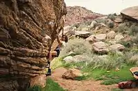 ![]() Derek Hersey, on the climb "the Bulge" in Eldorado Canyon, Colorado, circa 1990 | |