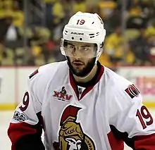 After three seasons with the Rangers, Brassard was the team's first offseason move in 2016, when he was traded to the Ottawa Senators on July 18 in exchange for Mika Zibanejad, who was "younger and faster" than Brassard.[100] Although both teams had discussed the details of the trade earlier, Ottawa general manager Pierre Dorion wanted to wait until after July 15 to sign off on the deal, as it forced the Rangers to retain Brassard's $2 million signing bonus.[101] Brassard joined the second line on his new team, serving as a left-handed skater to counterbalance first- and third-line centers Kyle Turris and Jean-Gabriel Pageau.[102] He opened the 2016–17 season in a scoring slump: his only goal in the first 15 games of the year came in the season opener, although he had an additional five assists in that same span.[103] He told reporters that it took "a while to adjust" to the new team, particularly coach Guy Boucher's affinity for changing offensive lines every game, but Brassard managed to finish the regular season with 14 goals and 39 points in 80 games.[104] The Senators clinched a spot in the 2017 Stanley Cup playoffs, and Brassard recorded an additional eight points in their first-round victory over the Boston Bruins.[104] Ottawa faced the Rangers in the second round of playoffs, and Brassard scored against his old team in the 3–1 series-clinching victory.[105] Altogether, Brassard had 11 points in 19 postseason games before Ottawa was ousted by the Pittsburgh Penguins in the Eastern Conference finals.[106][107]