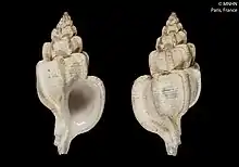 The length of the shell varies between 11 mm and 19 mm. The fusiform shell has a moderately high spire and a deep suture. The globose and smooth protoconch contains 1 1/2 whorl. The teleoconch shows strong, elevated, and rounded axial varices set quite far apart from each other (about 6 on the body whorl) and flat spiral cords which overrun the varices. The external surface form an intritacalx (= the chalky outer layer) which gives it a chalky appearance, even on fresh specimens, as is characteristic of the genus. The body whorl has maximum convexity just below the deep suture. Then it is rather parallel sided at the periphery and markedly constricted around the siphonal canal. The aperture is strongly thickened externally by the last varix, with an indistinct inner rim, bearing 5 faint denticles on aged specimens. It is glossy inside in contrast with the outer intritacalx. The siphonal canal is straight and open. The colour of the shell is dirty white, with indistinct yellowish lines along the spiral cords.[2]