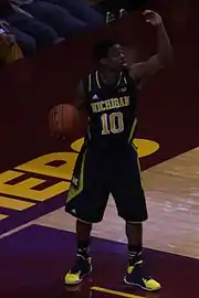 After playing only 19 of Michigan's 32 games the prior season for the 2014–15 Wolverines, Walton began the season as a starter against Northern Michigan.[57][58] On November 16 against Elon, Walton led all players with 24 points, six rebounds and seven assists. His performance included career highs of 24 points, eight field goals (10 attempts) and six three-point shots (seven attempts).[59][60] Walton sprained his ankle in the first half of the December 1 ACC–Big Ten Challenge victory over NC State.[61][62] The injury was caused when NC State's Abdul-Malik Abu stepped on Walton's foot.[63] In the subsequent game on December 5 against Houston Baptist, Caris LeVert started in his place at point guard while he sat out.[64][65] On December 15 against Northern Kentucky, Walton returned from the ankle injury that had sidelined him for three games, and posted 16 points, one rebound, one assist and one steal.[66][67] On December 19 against Youngstown State, Walton posted 10 points, 11 rebounds and 13 assists, becoming the fifth player in school history to record a triple-double.[68][69] The rebound and assist totals were career highs.[70] On January 12 with leading scorer Caris LeVert sidelined, Michigan defeated (#3/#3)[71] Maryland 7067 as Walton had a 12-point/10-rebound double-double.[72][73] On January 23, Walton's 19-point, 12-rebound double-double helped Michigan defeat Nebraska 8168,[74][75] and his 13-point, 10-rebound double-double on January 30 against Penn State helped lead Michigan to victory in the inaugural B1G Super Saturday game at Madison Square Garden.[76][77] On February 10, Michigan defeated Minnesota behind a career-high 26 points by Walton.[78][79] Following the 2015–16 Big Ten season, he was listed as a third-team All-Big Ten selection by the coaches and an honorable mention All-Big Ten selection by the media.[80][81][82] On March 11, during the quarterfinals of the 2016 Big Ten Conference men's basketball tournament against Indiana, Walton set a Big Ten tournament single-game record with 12 assists.[83][84] The record lasted 5 years until Mike Smith posted 15 for the Wolverines in the 2021 Big Ten men's basketball tournament.[85] Walton finished the Big Ten tournament with 22 assists over the course of the tournament, tying him for third on the all-time single tournament list with Brent Darby (2003),[86][87] until Denzel Valentine went on to total 28 assists for the tournament the next day.[88] On March 18, Michigan lost to No. 6 seed Notre Dame in the 2016 NCAA Division I men's basketball tournament, 63–70. Walton recorded a career-high six steals, along with ten points, eight assists and four rebounds.[89][90] Six steals broke a Michigan single-NCAA Tournament game record shared by Mitch McGary (2013), Ricky Green (1977) and Tom Stanton (1977).[91]
