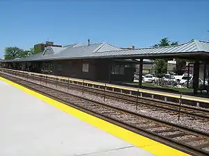 Des Plaines is one of two commuter railroad stations on Metra's Union Pacific Northwest Line in Des Plaines, Illinois. The station is located at 1501 Miner Street (US 14), and lies 16.7 miles (26.9 km) from the Ogilvie Transportation Center in Chicago.[2] In Metra's zone-based fare system, Des Plaines is in zone D. As of 2018, Des Plaines is the 30th busiest of the 236 non-downtown stations in the Metra system, with an average of 1,209 weekday boardings.[1]
