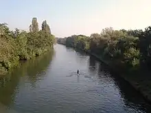 The cut was dug between 1930 and 1935, taking the river on a straight course between Weybridge and Walton, and avoiding a meandering stretch past Shepperton and Lower Halliford.[1] It is a very slight curve 1,093 metres (1,195 yd) long. Its geodesic length is 1,084 metres (1,185 yd) as the crow flies, and its construction created Desborough Island. Two bridges were built across the cut to link to the island, which contains a water treatment works and a large extent of open space used for recreation. The cut alleviated flooding in Shepperton[2] and halved the distance of travel on that part of the river.