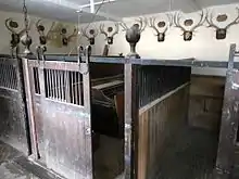 Stalls in stable block built by Sir Thomas Dyke Acland, 9th Baronet (1752–1794) at Holnicote. The thirty stag heads on the walls date from about 1787 to 1793 and were killed under his mastership of the Devon and Somerset Staghounds. A similar collection of stag heads amassed by his father the 7th Baronet, and much beloved by the latter, was destroyed during a fire at Holnicote in 1779[31]