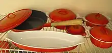 Descoware is a discontinued brand of porcelain- or enamel-coated cast iron cookware[1][2][3] Among notable Descoware pots are dutch ovens.[2][3] Although Descoware is now little-remembered, specialist sources hold that it was the favorite cooking ware of American cooking instructor and television personality Julia Child, more so than Le Creuset whose association with the chef has been widely reported.[4] Child regularly used Descoware on her television show The French Chef.[5] The Smithsonian Institution's installation about Child's kitchen featured a large orange Descoware pot on top of Child's own stove.[6]