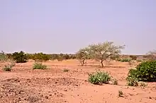In the Sahel, desertification is mostly attributed to wind erosion.[29] To put it simply, wind erosion is the phenomena when a strong wind removes a field's topsoil. Wind erosion depletes the nutrients in the soil because the topsoil often contains more nutrients than the subsoil.[30][31][32] This lowers the production of the soil. Furthermore, the loss of topsoil can expose subsurface with inferior physical qualities, which lowers the permeability of the soil. Furthermore, wind erosion can hinder crop growth by burying crops beneath blown sand and causing physical harm (abrasion).[33][34]