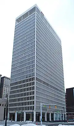 The One Woodward Avenue Building (Michigan Consolidated Gas Company Building) is a 32-story, flat-roofed skyscraper with a steel frame. It was built in 1960–62, and designed by Minoru Yamasaki and Smith, Hinchman, and Grylls; the building was apparently a model for Yamasaki's later work of the World Trade Center in New York.[20] The building rests on a platform, approached via entrance staircases, with a reflecting pool and tall glass-enclosed lobby emphasizing the airy lightness.[21] White concrete panels hold the hexagonal windows in place.[1] The three-story glass panels were the tallest ever installed at the time.[21]