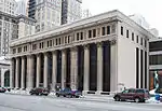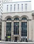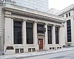 The building is Neoclassical in design, with eight Corinthian pillars and four similar pilasters arranged across the facade. Kahn's design for this building was influenced by McKim, Mead, and White's nearby State Savings Bank.[41] A series of windows interspersed by plaques with foliated details are set in the attic story. The building was modernized in 1964, and the front section between the columns was rebuilt.