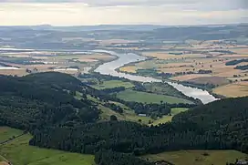 ![]() Deuchny Wood from the air, looking east over the River Tay and the Carse of Gowrie | |