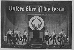 During the meetings the members of DV wore a uniform outfit consisting of black pants or a skirt, a white shirt and a black tie. Wearing these clothes in public places was forbidden and resulted in a fine for the infringement. The DV sign was a white arrow on the black background - the Tiwaz.[4]