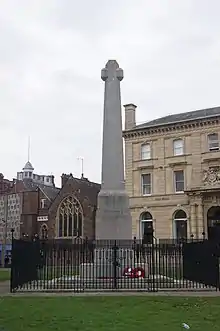 The Devon County War Memorial is a First World War memorial, designed by Sir Edwin Lutyens and situated on Cathedral Green in Exeter, the county town of Devon, in the south west of England. It is one of fifteen War Crosses designed by Lutyens with similar characteristics, and one of two to serve as a civic memorial in a city. The first proposal for the county's war memorial was to complete the construction of a cloister at Exeter Cathedral to be dedicated to Devon's war dead, but this scheme was abandoned due to lack of funds. After considering multiple proposals, the Devon County War Memorial Committee commissioned Lutyens to design a War Cross instead. The committee chose to site the memorial on the green of Exeter Cathedral after scouting several locations. A war memorial for Exeter itself was being considered concurrently, but the committees for the two projects failed to work together, resulting in two separate memorials—the county memorial by the cathedral and Exeter City War Memorial in Northernhay Gardens.