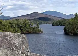 Dewey Mountain (center), Saranac Lake, New York, from Bluff Island, Lower Saranac Lake. McKenzie Mountain at right