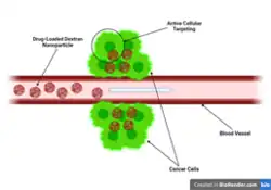 Dextran nanoparticles are 1-100 nm sized particles with drug encapsulation capability. The high surface area of these nanoparticles allows more drugs to be loaded and encapsulated, leading to higher drug concentrations at the target site. The small size of these particles also encourages cellular uptake, which makes dextran nanoparticles a potential effective drug delivery system for targeting tumor cells.[1]