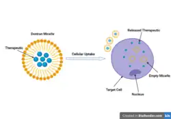 Dextran micelles are 10 to 100 nm sized amphiphilic polymeric particles which have the advantages of avoiding drug clearance by the kidneys and traveling through blood vessels.[1] The core of these micelles are hydrophobic, allowing for loading of hydrophobic drugs into the micelle. The outer shell of the particles is hydrophilic, which allows for long circulation times in the blood.[5] Dextran can be conjugated with other materials to form polymeric micelles including stearic acid and cholesterol to further improve sustained release of the loaded hydrophobic drug. The size of the micelles can be controlled by altering the ratio of stearic acid to dextran.[5] Dextran micelles can also be formed from conjugation with polycaprolactone, folic acid, retinoic acid, and PLGA.[1]