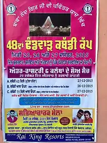 A kabbadi mela is held every year in Dhandwar. It is one of the biggest kabbadi tournaments in Punjab, all international clubs play at Dhandwar. Every year-end of 24, 25 and 26 December. The tournament has been held at the Dhandwar school ground since 1957, village motive is to protect youth from drugs. Also, many adults and youth play cricket, Football on the village ground and on the ground of bava nand gir ji.