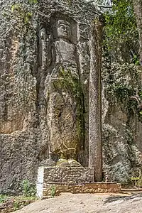 The temple is famous for its large 12 m (38 ft) high unfinished Buddha image, which is carved into the vertical granite rockface. The image is an example of Mahayana sculpture.