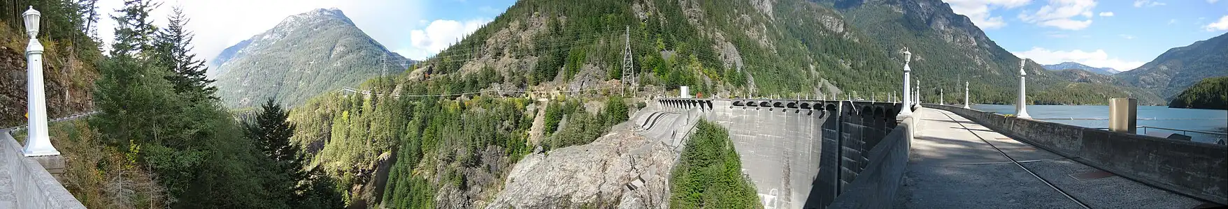 Diablo Dam is one of three dams along the upper Skagit River in Whatcom County, Washington and part of the Skagit River Hydroelectric Project that supplies Seattle with some of its power needs. The dam was built in Diablo Canyon, a gorge of solid granite with vertical walls rising 160 feet (49 m) from the river bed, yet were less than 100 feet (30 m) apart. Construction began in 1927, and was completed in 1930. The dam began generating electricity in 1936.[4]