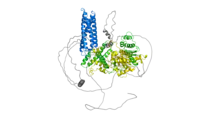 DAGLβ structure, folded with AlphaFold.[1][2][3] Transmembrane domain in marine blue. Catalytic domain in yellow. Note missing C-terminal tail. See Structure for details. Click image for higher resolution.