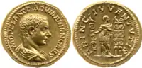 While caesar, a large number of coins were struck for Diadumenian, although fewer than the amount struck for his father. Coins in which he is depicted as augustus are extremely limited, and the only known coins from this time are denarii. This has led to the suggestion, first proposed by the ancient numismatist Curtis Clay, that a large issue of coins was being made for Diadumenian; however, they were quickly melted down when the news of Macrinus' defeat spread. Some eastern provincial coins from the period exist which give Diadumenian the title sebastos, at the time the Greek equivalent of the Roman augustus.[9] In terms of gold coins, Diadumenian has one known style of aureus, bearing his image on the obverse and displaying Spes standing on the reverse, and one known style of half-aureus, bearing his image on the obverse and displaying himself holding a sceptre and standard.[17]
