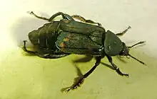 Diamesus is a genus of rather large carrion beetle with two species distributed in tropical Asia and Australia. Like other Silphinae, it has an antenna with 11 segments. About 3 or 4 abdominal segments are visible beyond the tip of the elytra. The elytra themselves have longitudinal keels. The type species is Diamesus osculans.[1] The larvae are broad and flat and somewhat cockroach-like (blattiform).[2]
