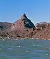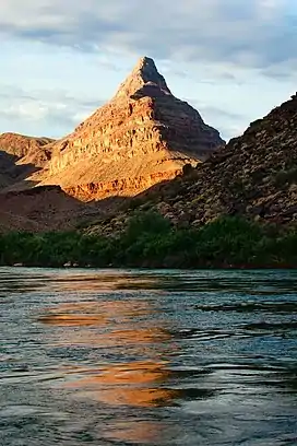 Diamond Peak is a 3,512-foot-elevation (1,070  meter) summit located in the western end of the Grand Canyon, on the Hualapai Indian Reservation in Mohave County of northwestern Arizona, United States.[2][4] This double summit landmark is situated at the mouth of Peach Springs Canyon, where Diamond Creek meets the Colorado River. This peak is an erosional remnant composed of Cambrian Muav Limestone and Mississippian Redwall Limestone.[5] Topographic relief is significant as Diamond Peak towers 2,200 feet above the Colorado River in one-half mile.[6] According to the Köppen climate classification system, Diamond Peak is located in a desert climate zone.[7]