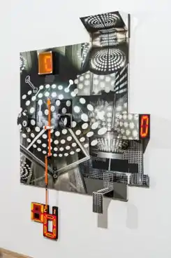 Several later exhibitions feature more self-contained pieces, sometimes working in relation to one another.[2] The installation The Wall (2018) presented several dozen, disparate smaller works hung salon-style, which together functioned like a diaristic, graphic index of Cooper's concerns.[34] "Sightings" (2019) consisted of more autonomous works and closed compositions that referenced and framed distinct, bound systems of urban structure, electronics and technology in order to encourage new ways of seeing (e.g., Slide Rule or Family Safe).[19]