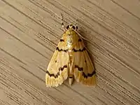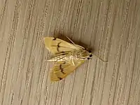 The wingspan is about 20 mm. Adults are bright yellow, with black zig-zag lines across the wings, and a prominent black spot near the middle of each forewing.[2]