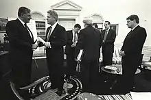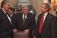 In the summer of 1997, several House Republicans attempted to replace Gingrich as Speaker. The attempted "coup" began on July 9 with a meeting between Republican conference chairman John Boehner of Ohio and Republican leadership chairman Bill Paxon of New York. According to their plan, House Majority Leader Armey, House Majority Whip Tom DeLay, Boehner, and Paxon were to present Gingrich with an ultimatum: resign, or be voted out. Under the new plan, Paxon was to replace Gingrich as Speaker. However, Armey balked at the proposal, and told his chief of staff to warn Gingrich about the coup.[9] On July 11, Gingrich met with senior Republican leadership to assess the situation. He explained that under no circumstance would he step down. If he were voted out, there would be a new election for Speaker, which would allow for the possibility that Democrats and dissenting Republicans would vote in Dick Gephardt as Speaker. Paxon resigned his post, feeling that he had not handled the situation correctly.[10][11][12] Paxon later considered, then rejected, a challenge to Armey's post as majority leader, and did not run for re-election in 1998.[13]
