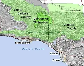 The Dick Smith Wilderness is a wilderness area in the mountains of eastern Santa Barbara County, California, United States, with a portion in Ventura County. It is completely contained within the Los Padres National Forest, and is northeast of the city of Santa Barbara and north of the city of Ojai. It is most easily accessible from two trailheads off State Route 33, which runs north from Ojai. It is adjacent to the large San Rafael Wilderness on the west and the Matilija Wilderness on the south. Across Highway 33 to the east, and also in the Los Padres National Forest, is the large Sespe Wilderness.