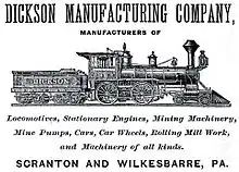 Dickson Manufacturing Company was an American manufacturer of boilers, blast furnaces and steam engines used in various industries but most known in railway steam locomotives. The company also designed and constructed steam powered mine cable hoists. It was founded in Scranton, Pennsylvania by Thomas Dickson in 1856. In total, the company produced 1,334 steam locomotives until it was taken over by ALCO in 1901.[1]