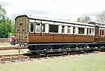 Built in 1900 at Swindon. Originally 14-ton but later 16-ton. Stored amongst other stock in staff use, verandah is covered by inside tarpaulin for protection. | |
